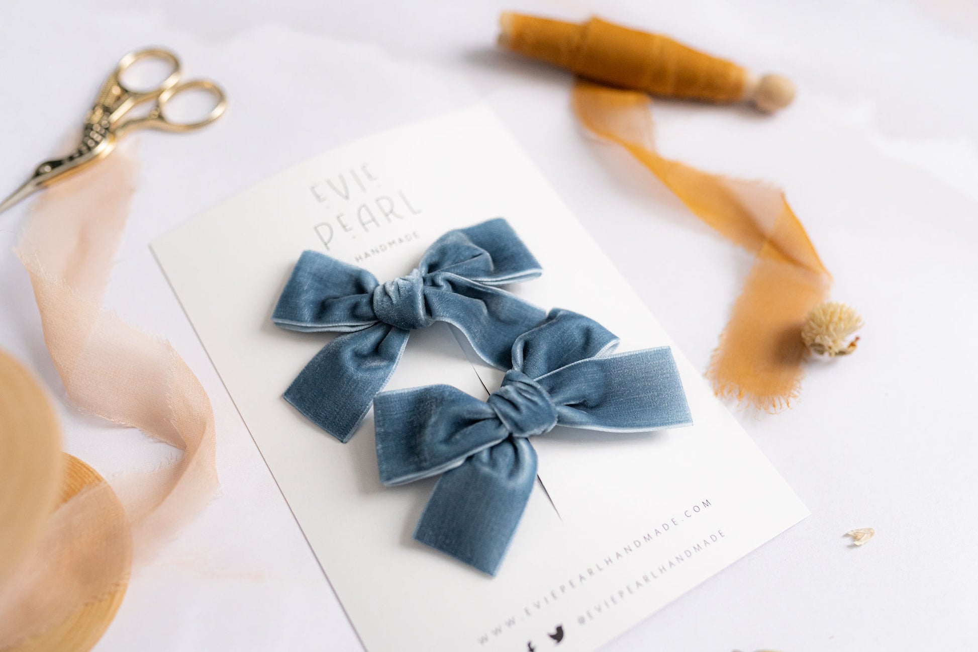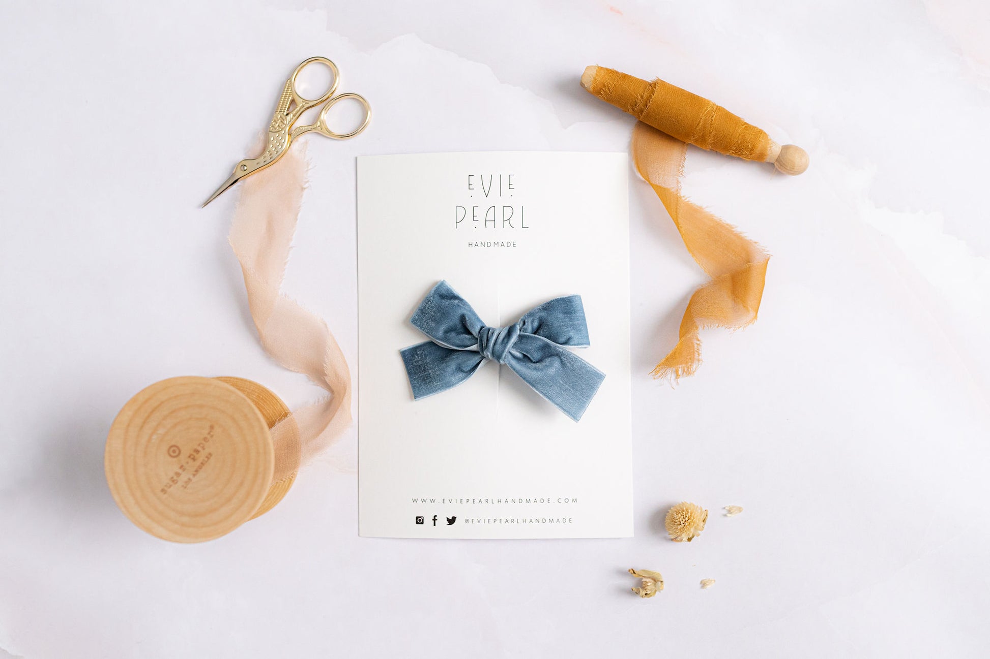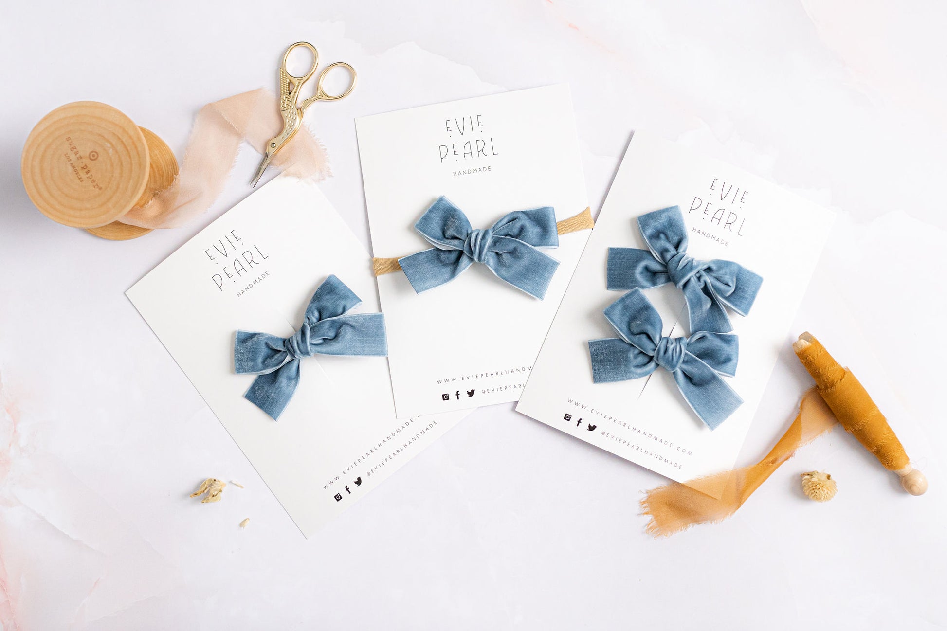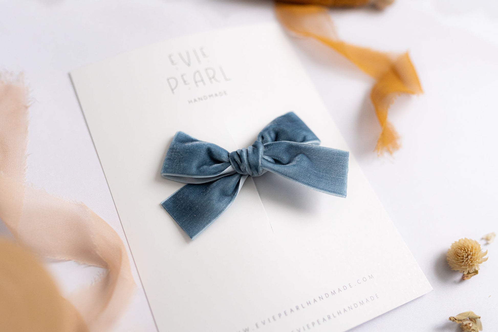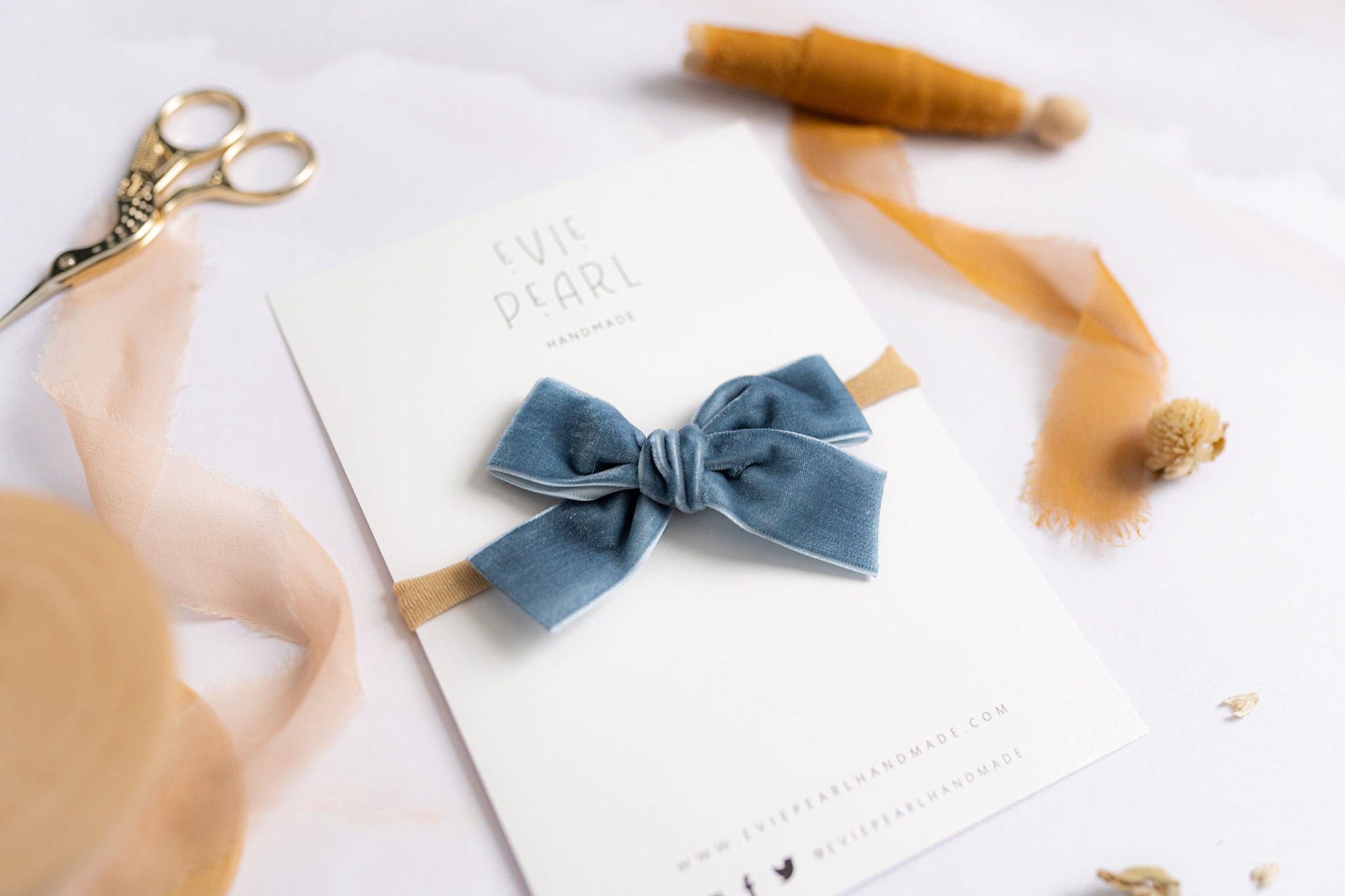 Use the drop-down menu to choose an option from the alligator clip, nylon headband, or pigtails. All come with beautiful blue velvet bows, hand-tied and hand-dyed with love. The headbands are available in three colors - latte, mocha, and espresso, so don’t forget to mention your preference at checkout.