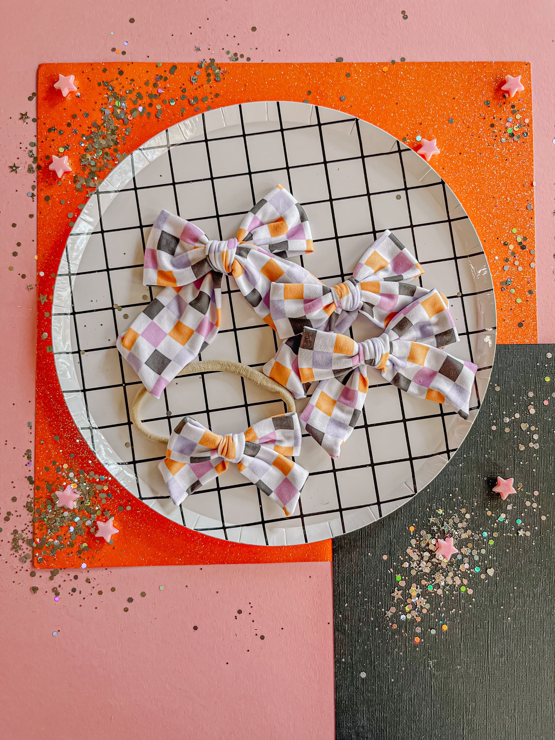 Black|Orange|Purple|Lilac Checkered Pinwheel Bow