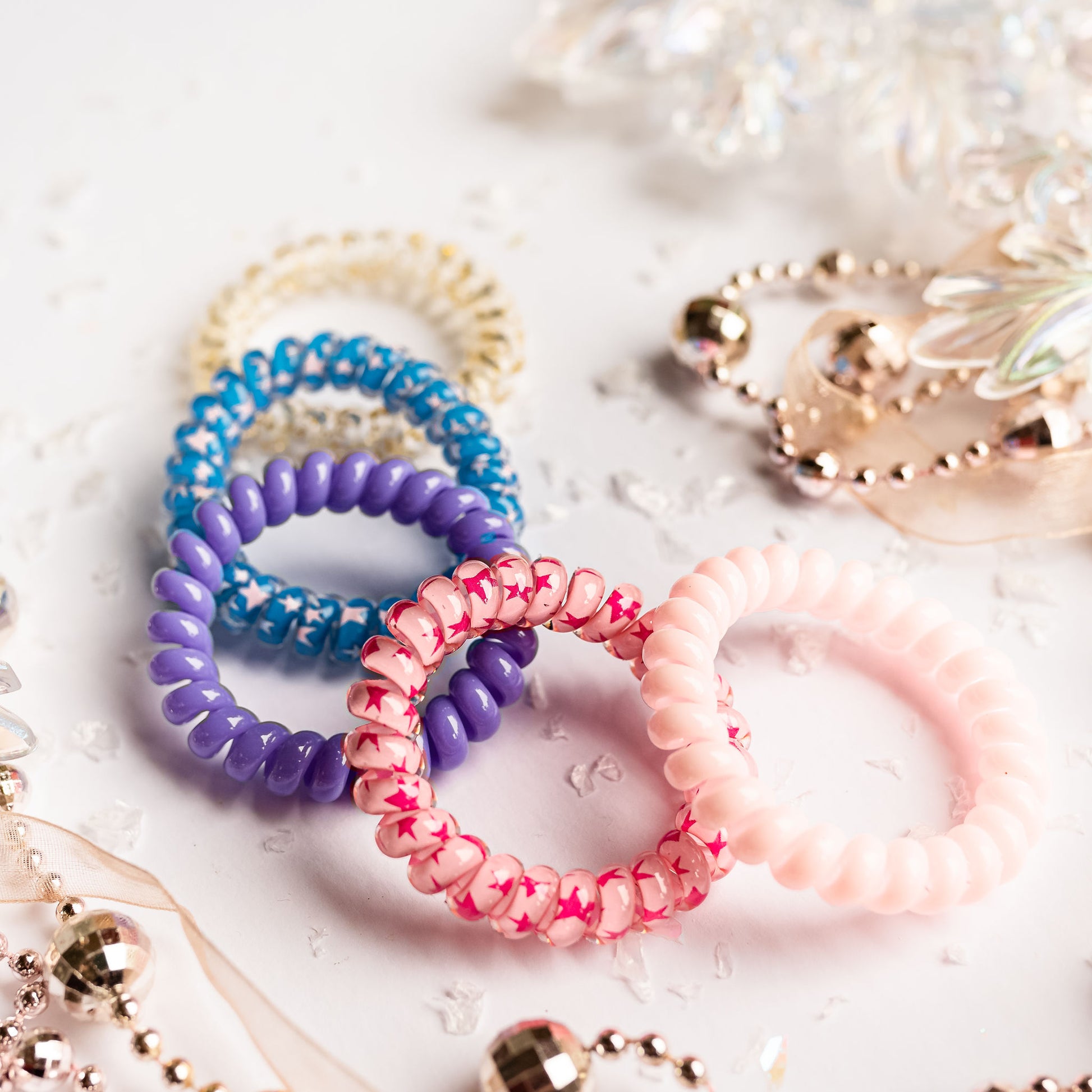 Random colors selected. Comes in a pack of 5 spiral hairties. These hairties do not leave creases in your hair.
