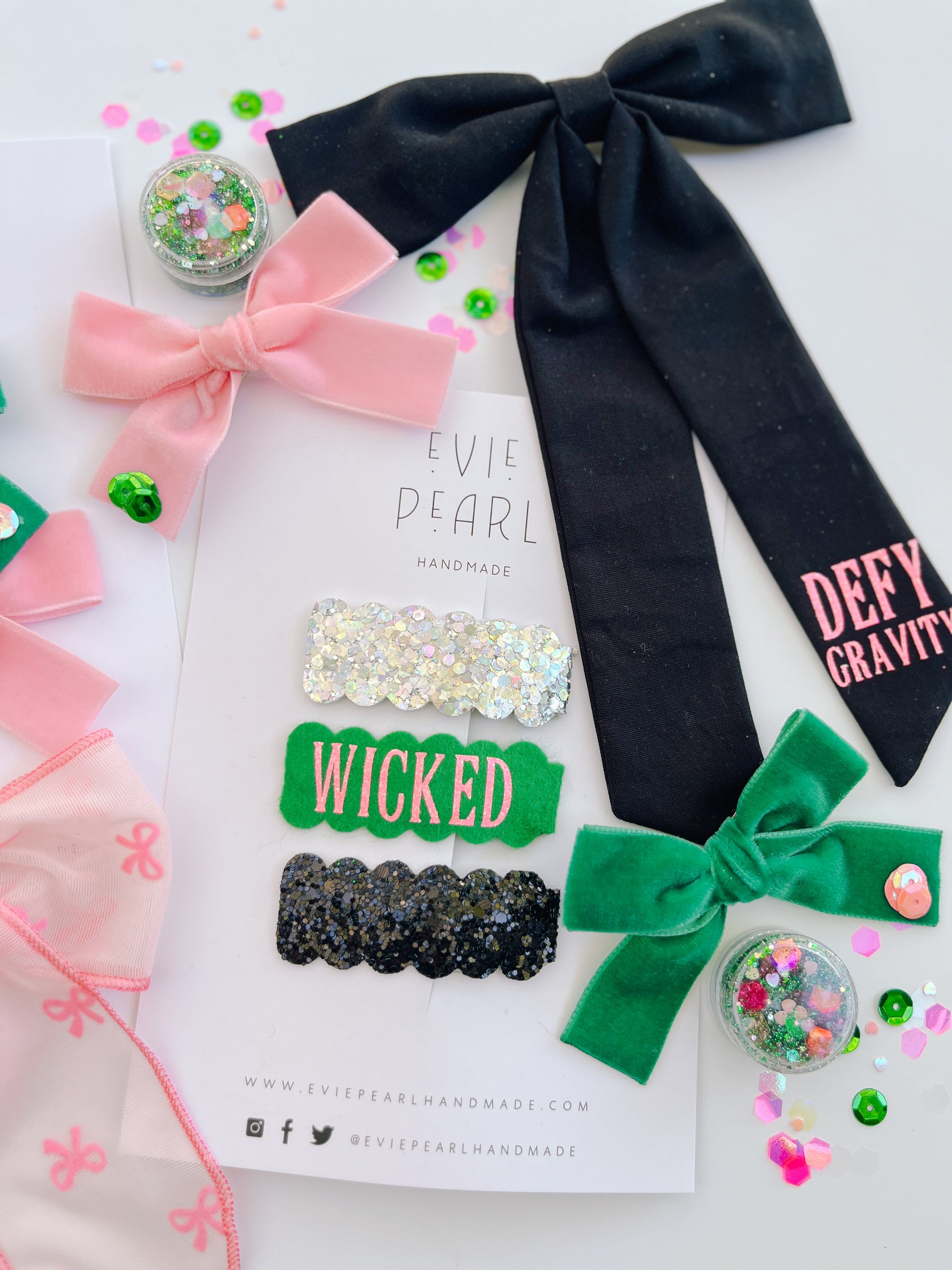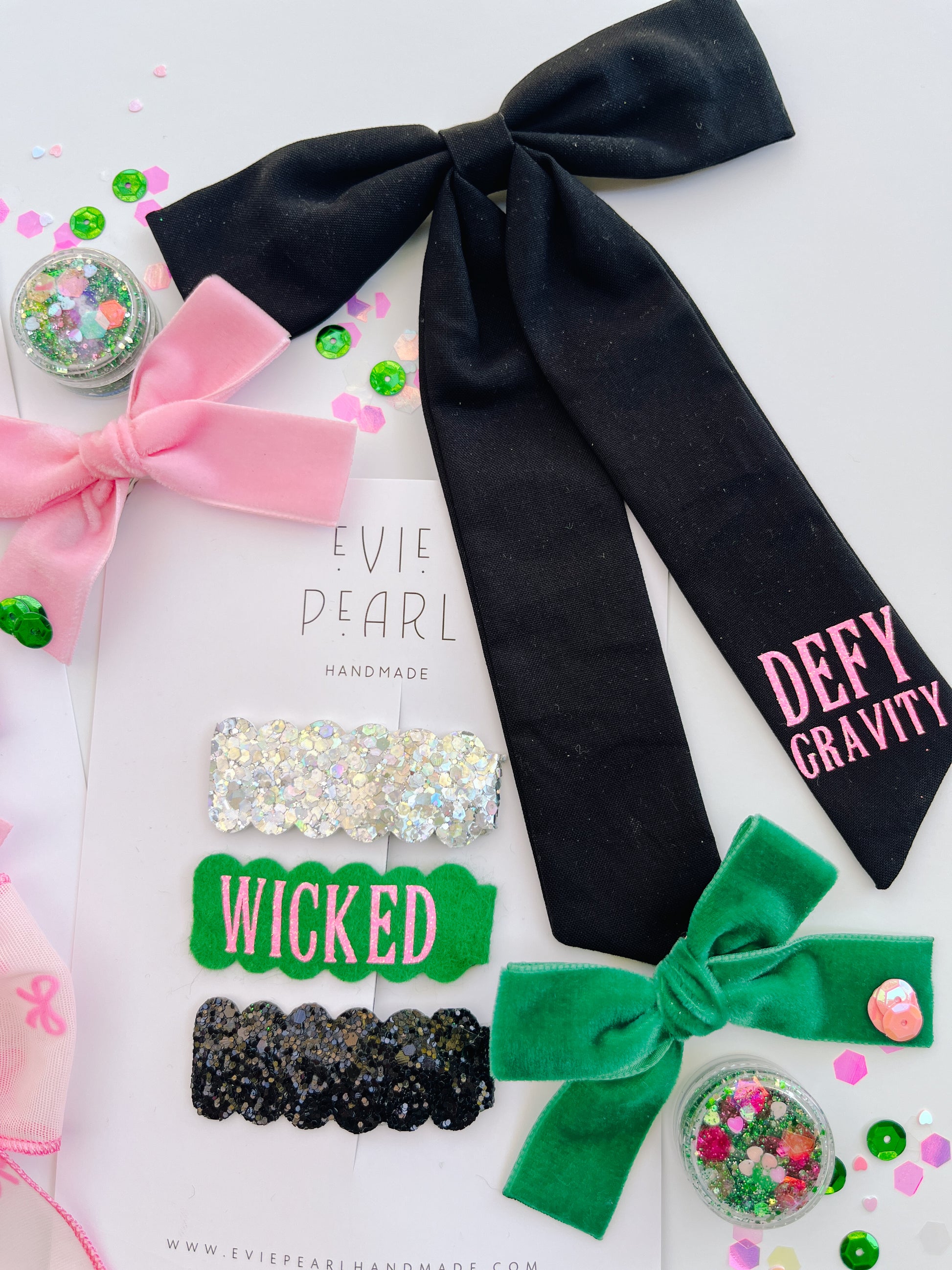 Whether you’re off to see Wicked the Movie 2, heading to Broadway, or simply channeling your inner Elphaba, this glittery bow adds the perfect touch of magic to any hairstyle. Soft, dramatic, and full of sparkle, it’s the ultimate accessory for any good witch or bad witch who believes in a little bit of magic — because some girls don’t just wear bows… they defy gravity. 💫