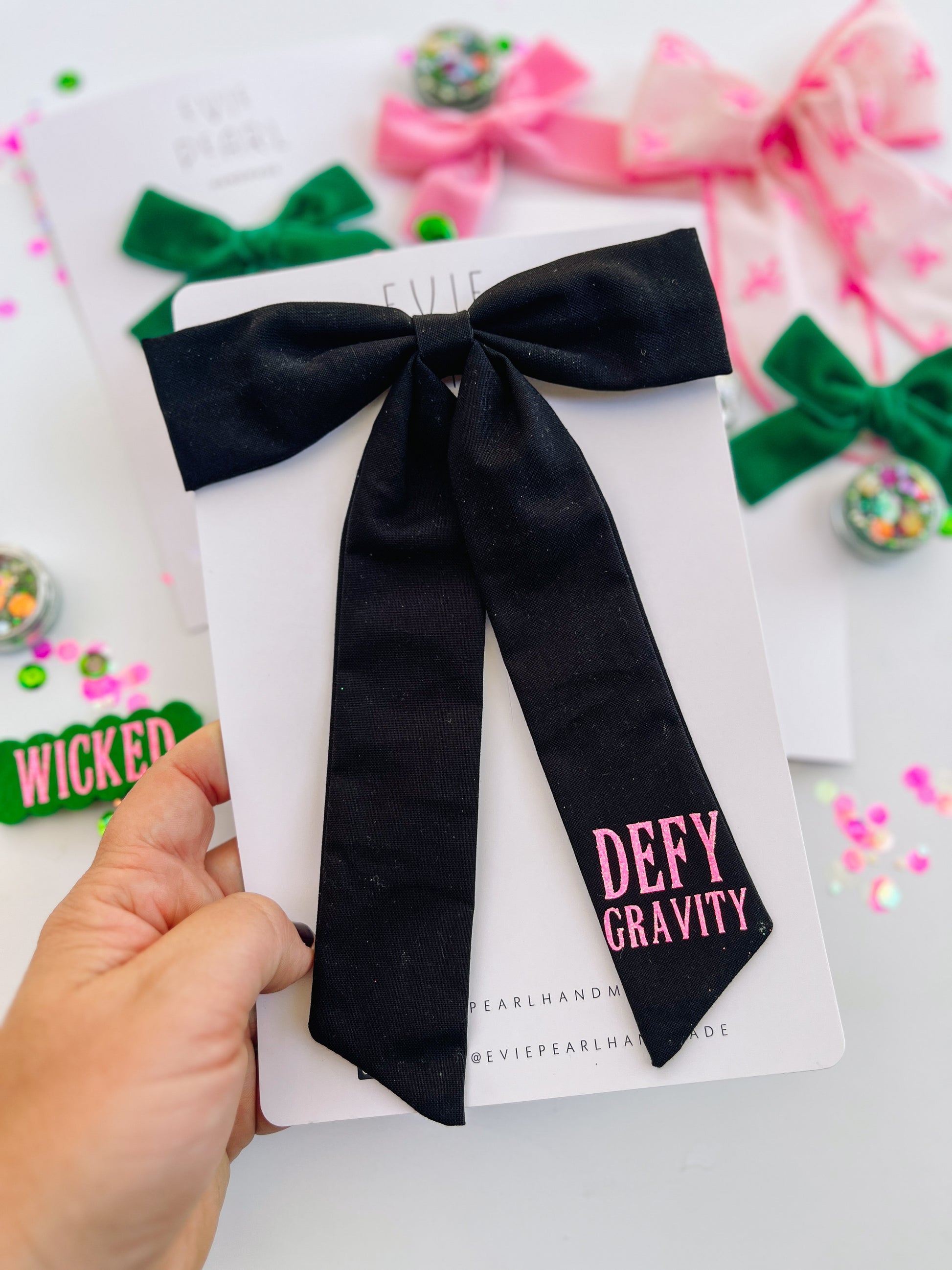 Defy gravity in style with our Wicked-Inspired Long-Tailed Black Bow — a show-stopping hair accessory made for every girl who dreams of Oz! 🪄✨ This handmade solid black velvet bow features shimmering pink glitter script on the tails that reads “Defy Gravity”, inspired by one of Broadway’s most beloved anthems. Measuring approximately 7 x 5”, this bold statement bow is secured on a large right-facing alligator clip, perfect for girls, teens, and moms alike.