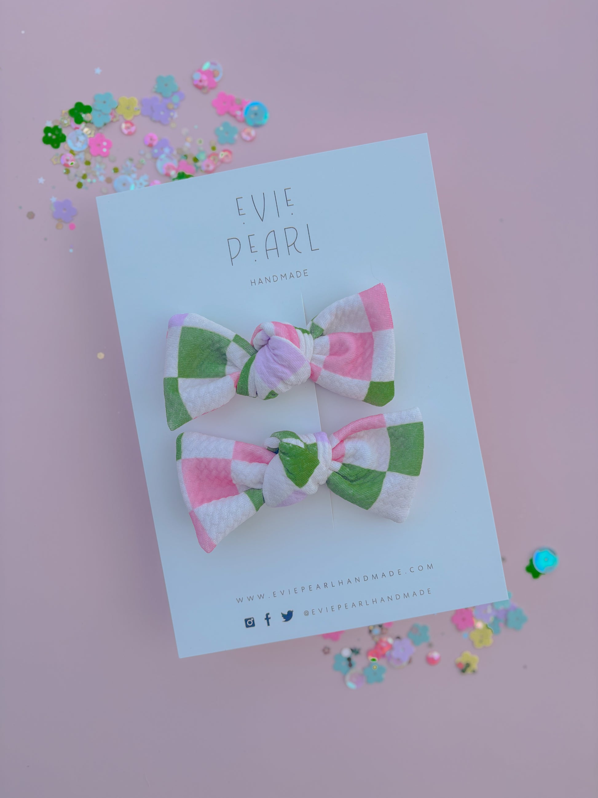 Green, Pink, Lilac Checkered Knot Bow Pigtail Set