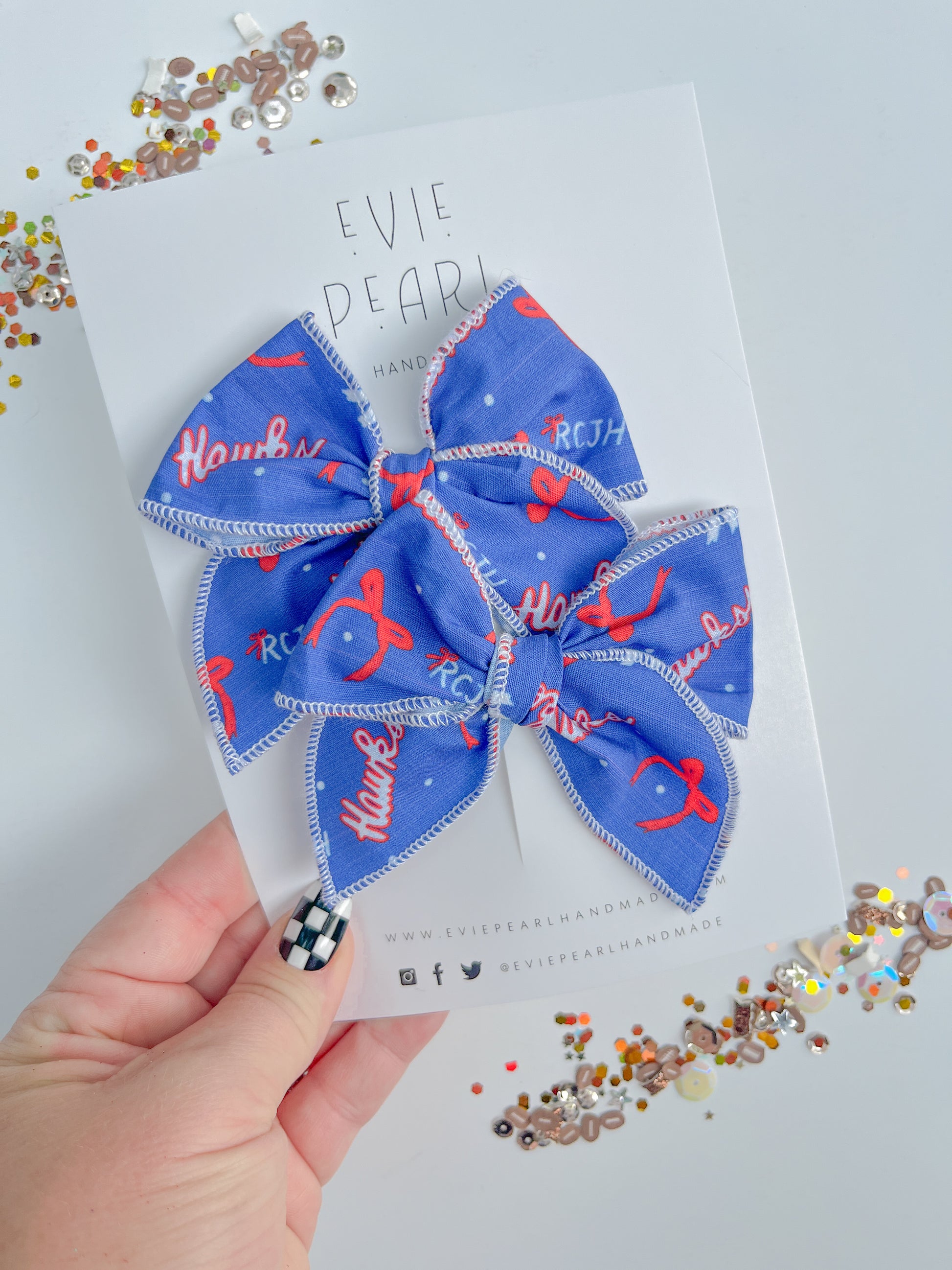 Cheer on Kansas in style with our Rock Chalk Jayhawk inspired bows, handmade in bold crimson and blue fabrics for the ultimate game day accessory. Perfect for girls and women, these bows come on sturdy alligator clips that grip all hair types and can be worn with ponytails, pigtails, or half-up styles. A must-have for KU basketball, football, and everyday school spirit.