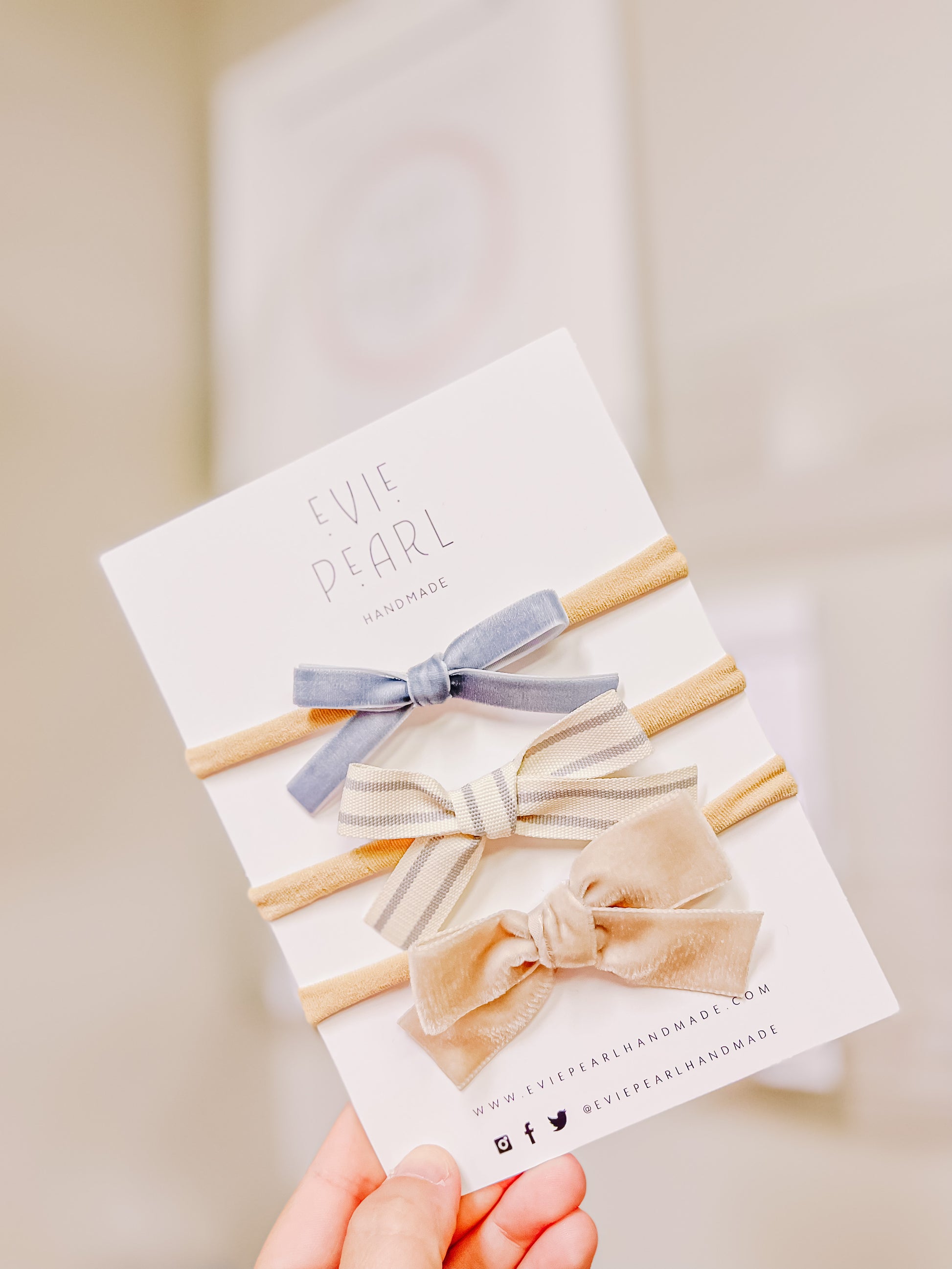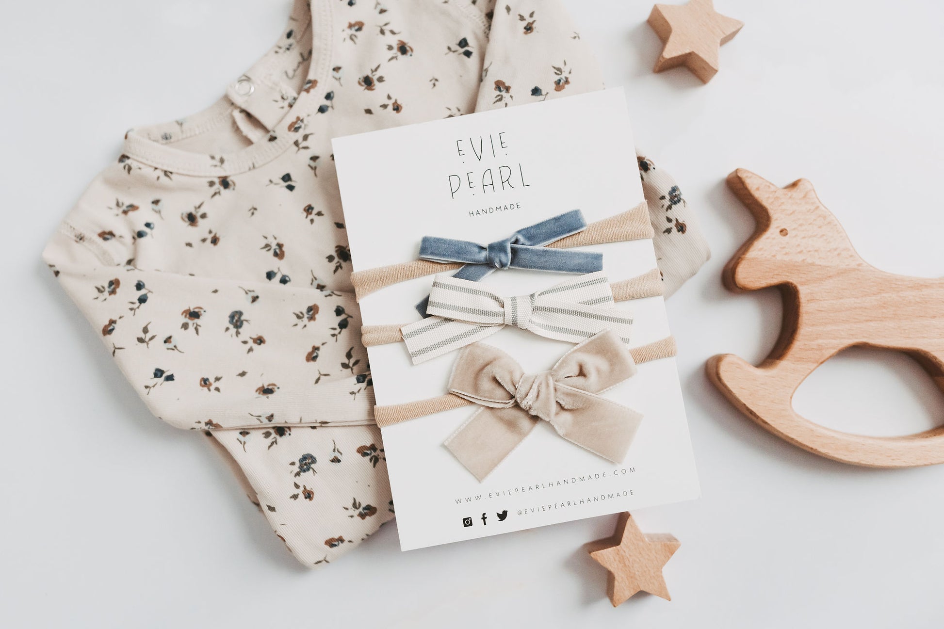 Newborn Baby Trio Headband Set- blue velvet, gray stripe and tan velvet