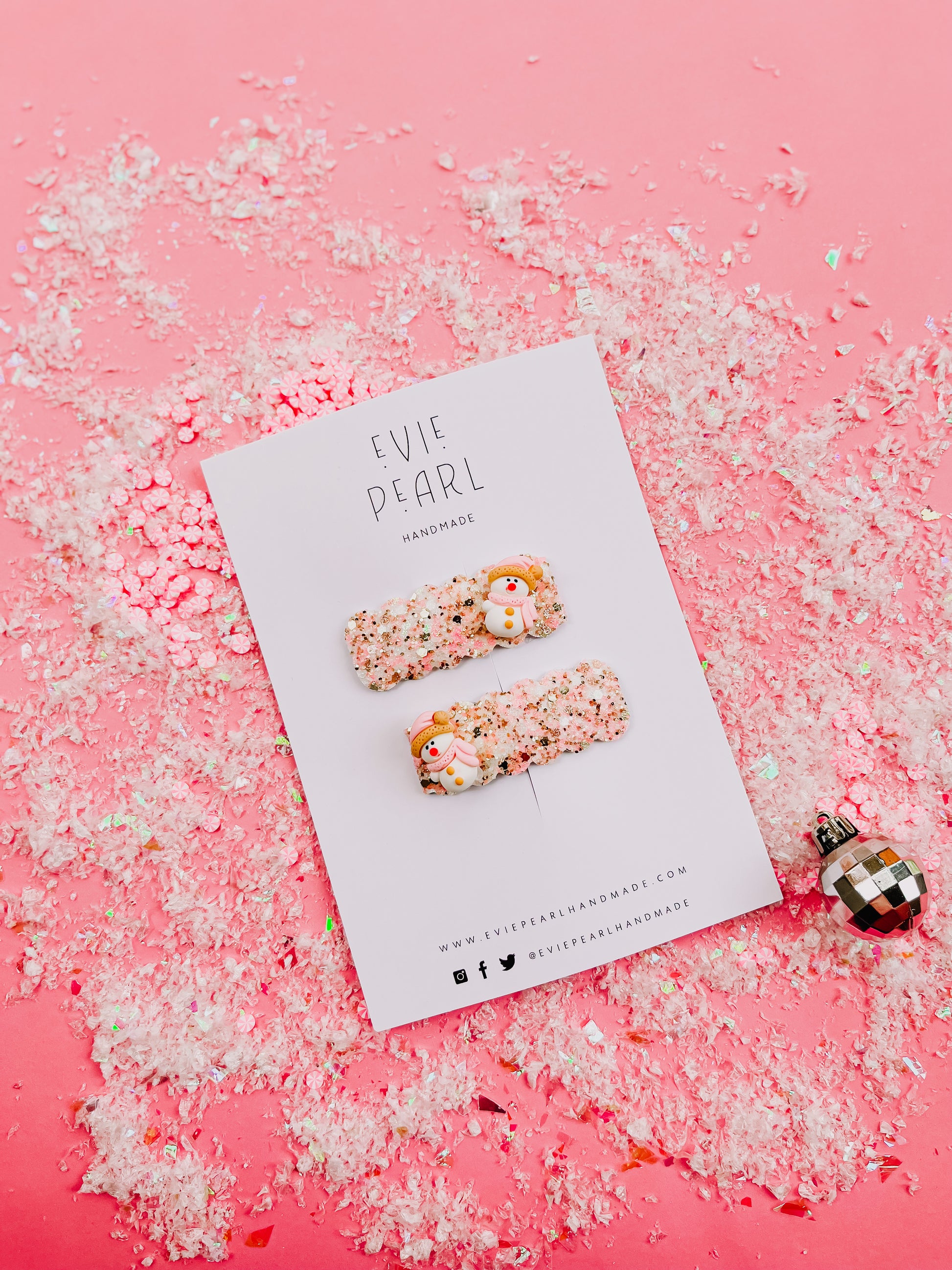 This listing is for two snap clips. These scalloped edge hair barrettes have a red mitten attached to each clip.