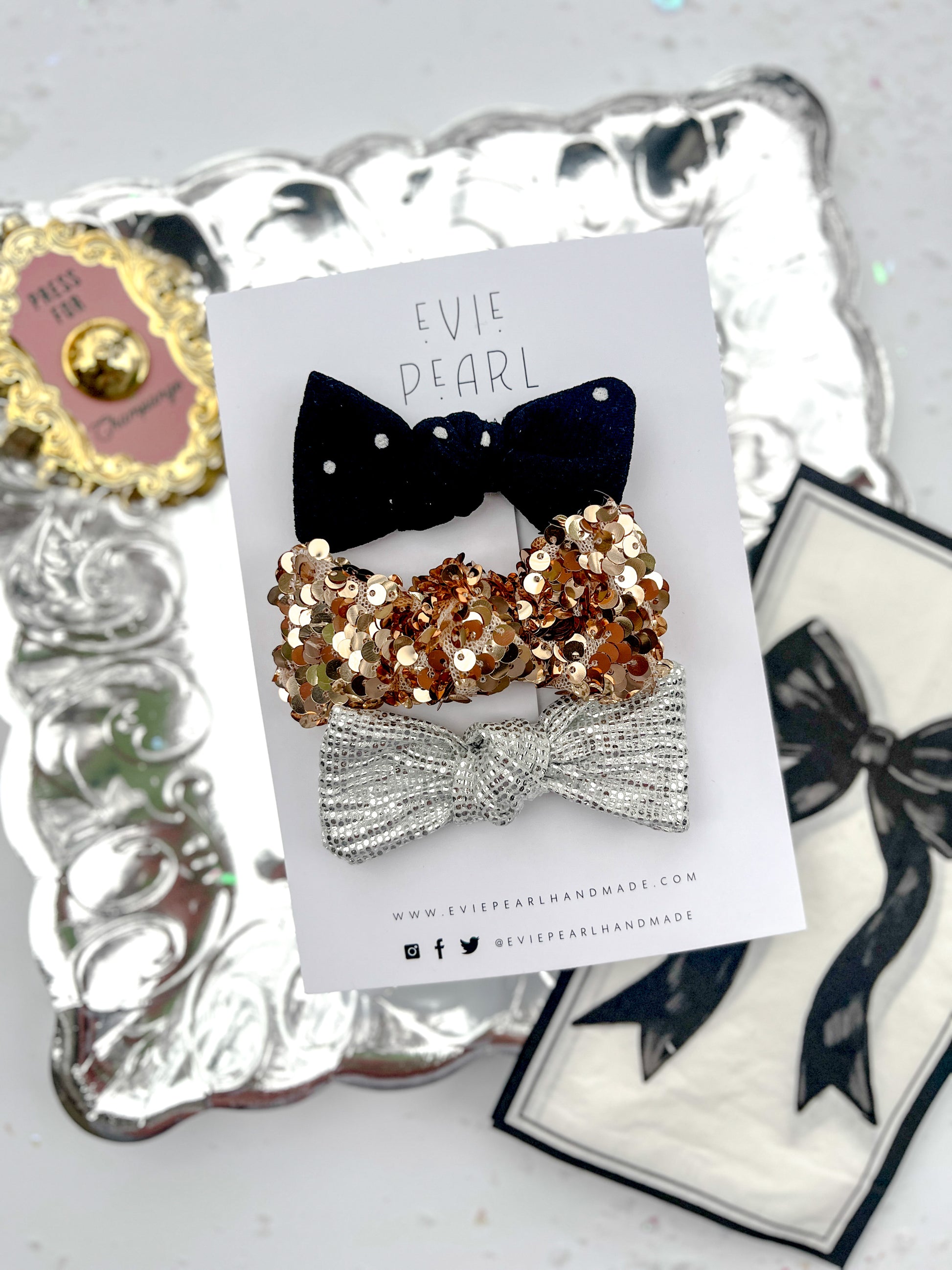 Black Polka Dot, Gold Sequins & Silver Trio Knot Bow Set