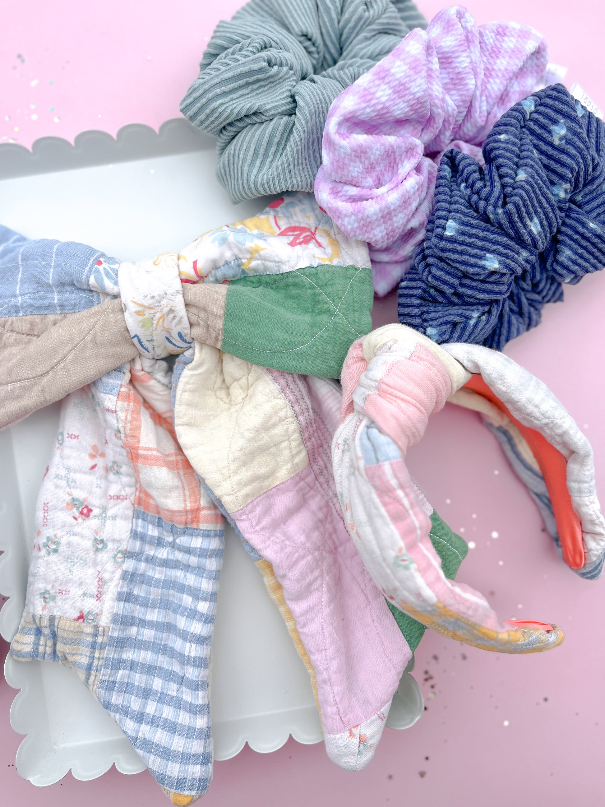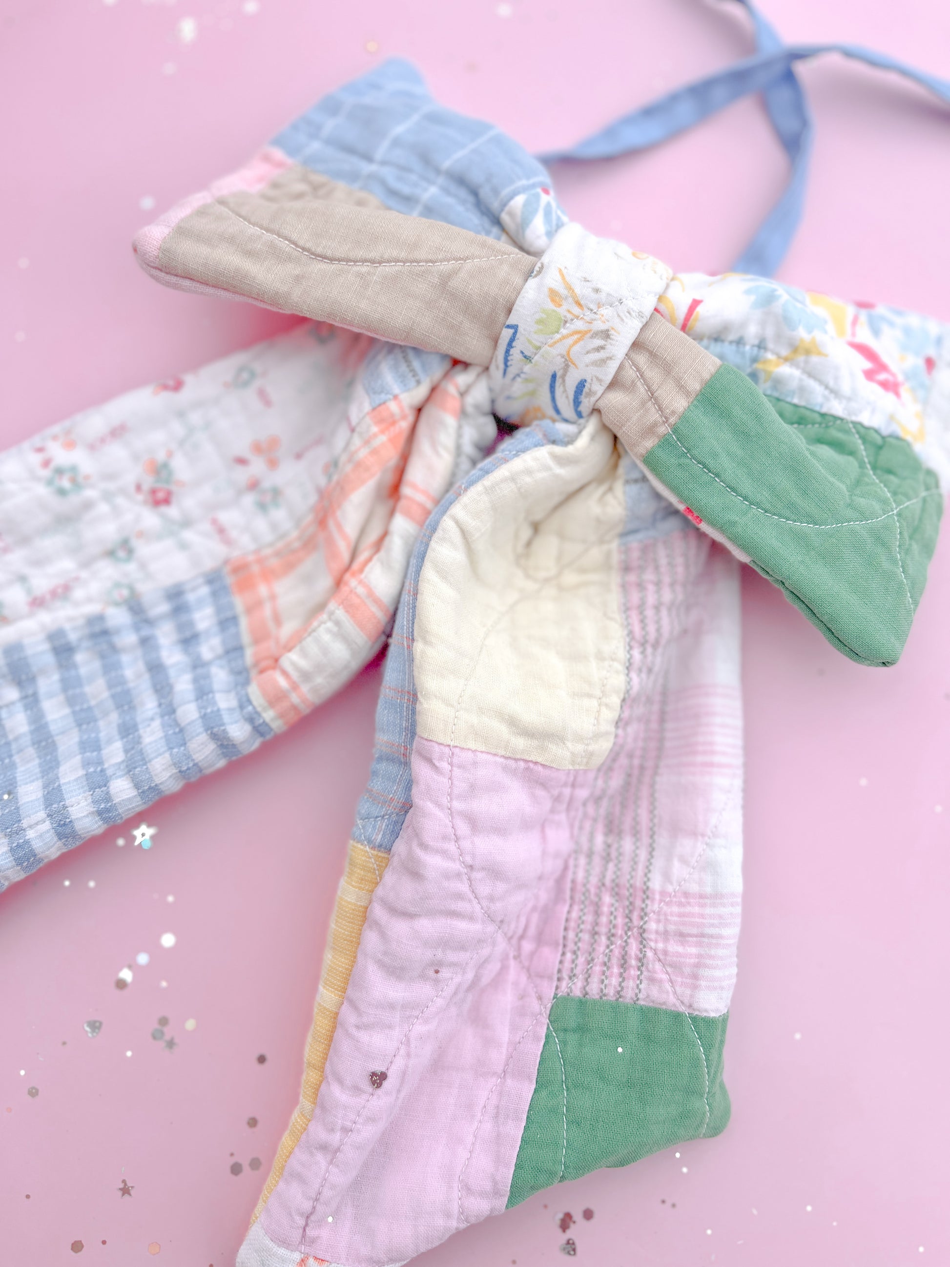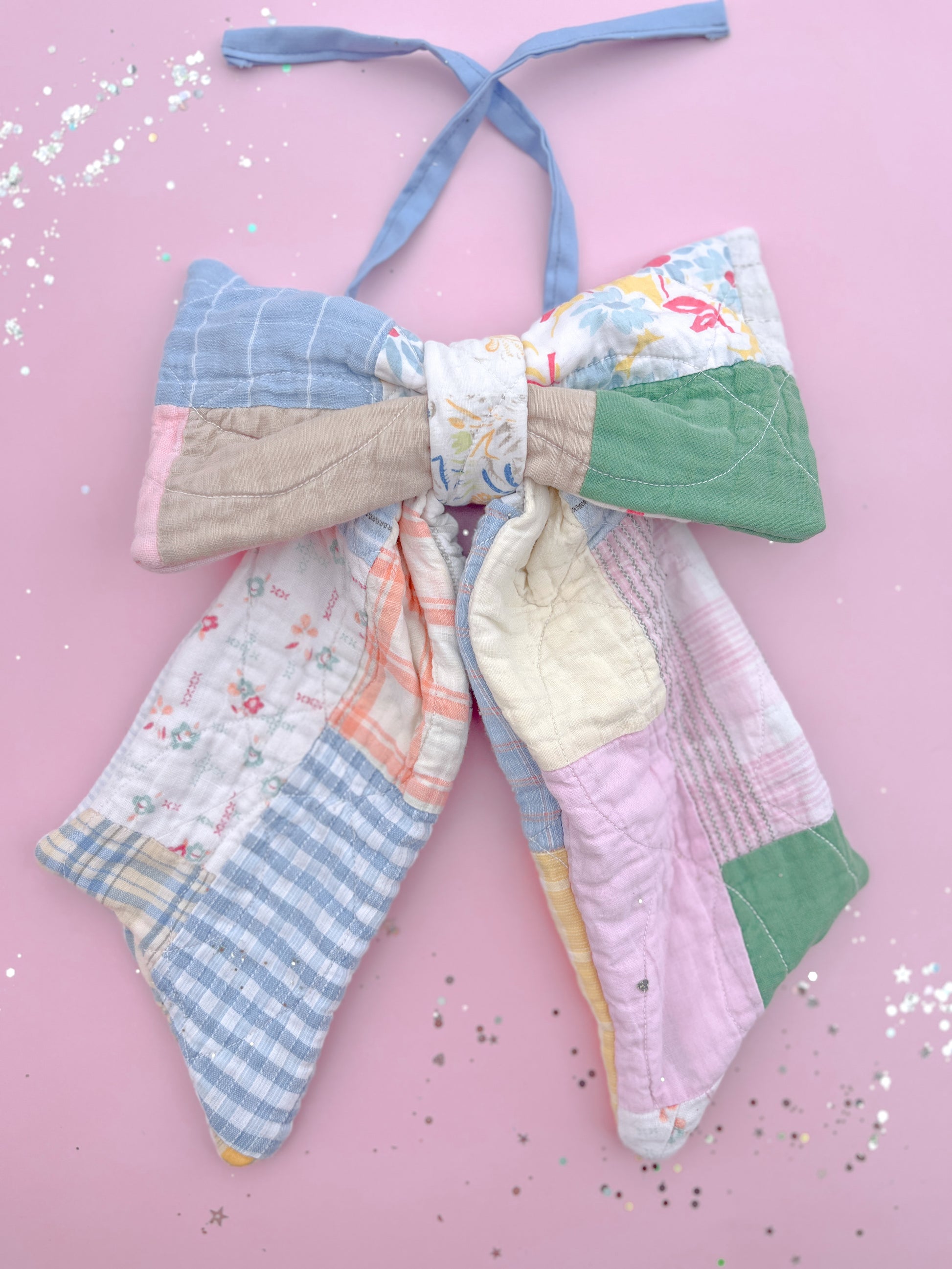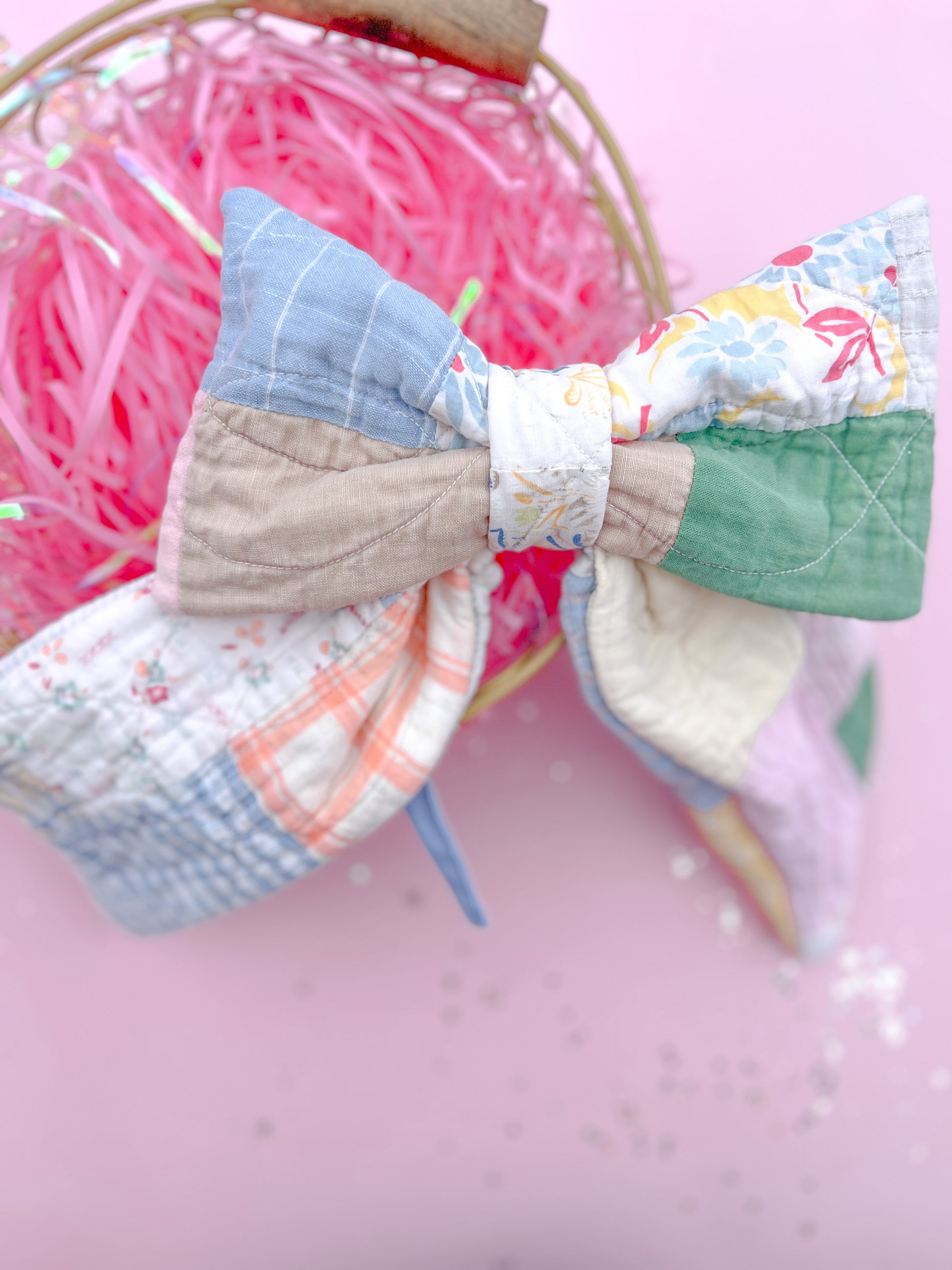 Because every bow is made from authentic quilted patchwork fabric, no two pieces will ever look the same. Each bow features a unique mix of soft spring colors and charming quilt patterns, creating a timeless heirloom accessory you will treasure year after year.