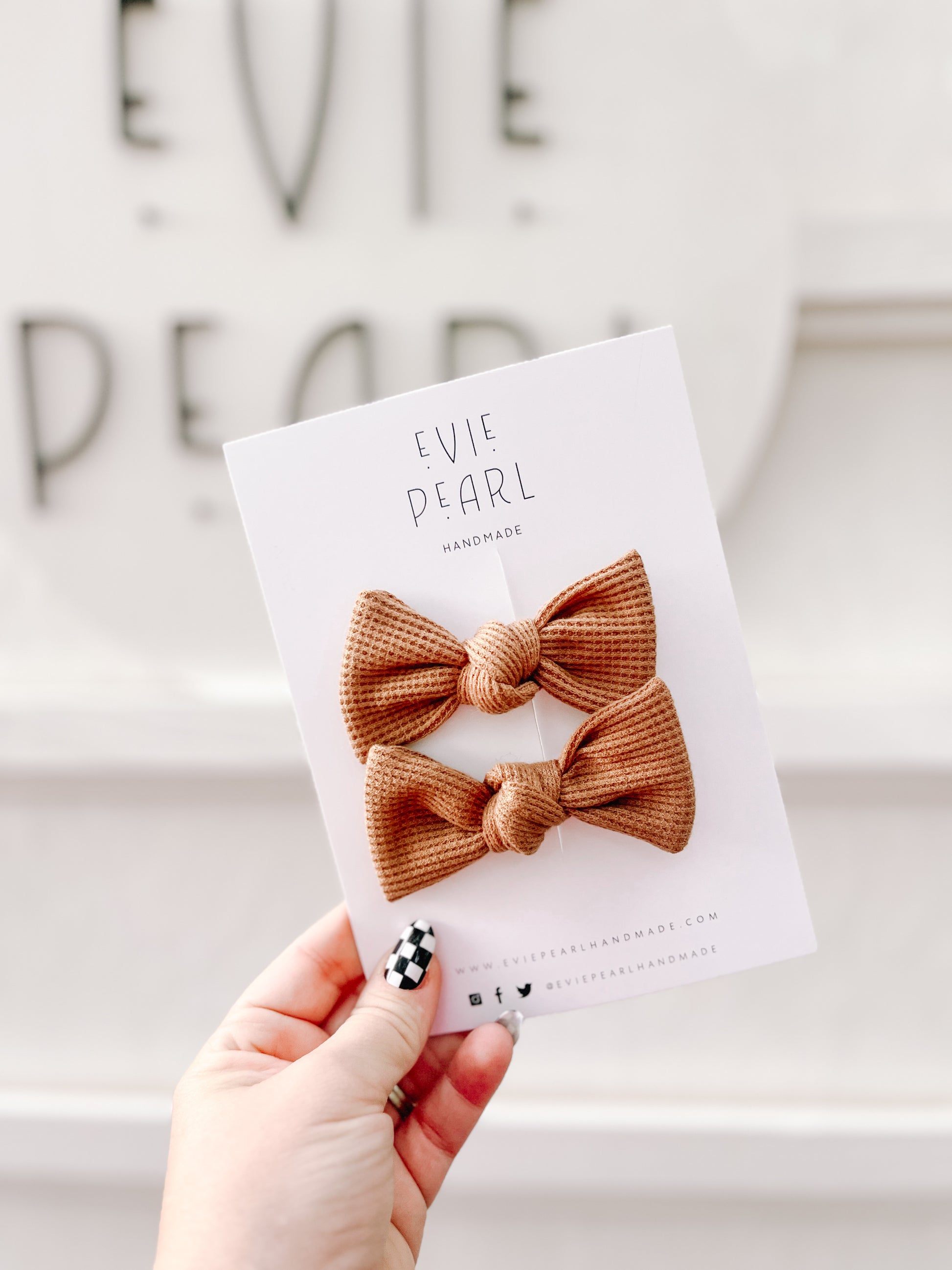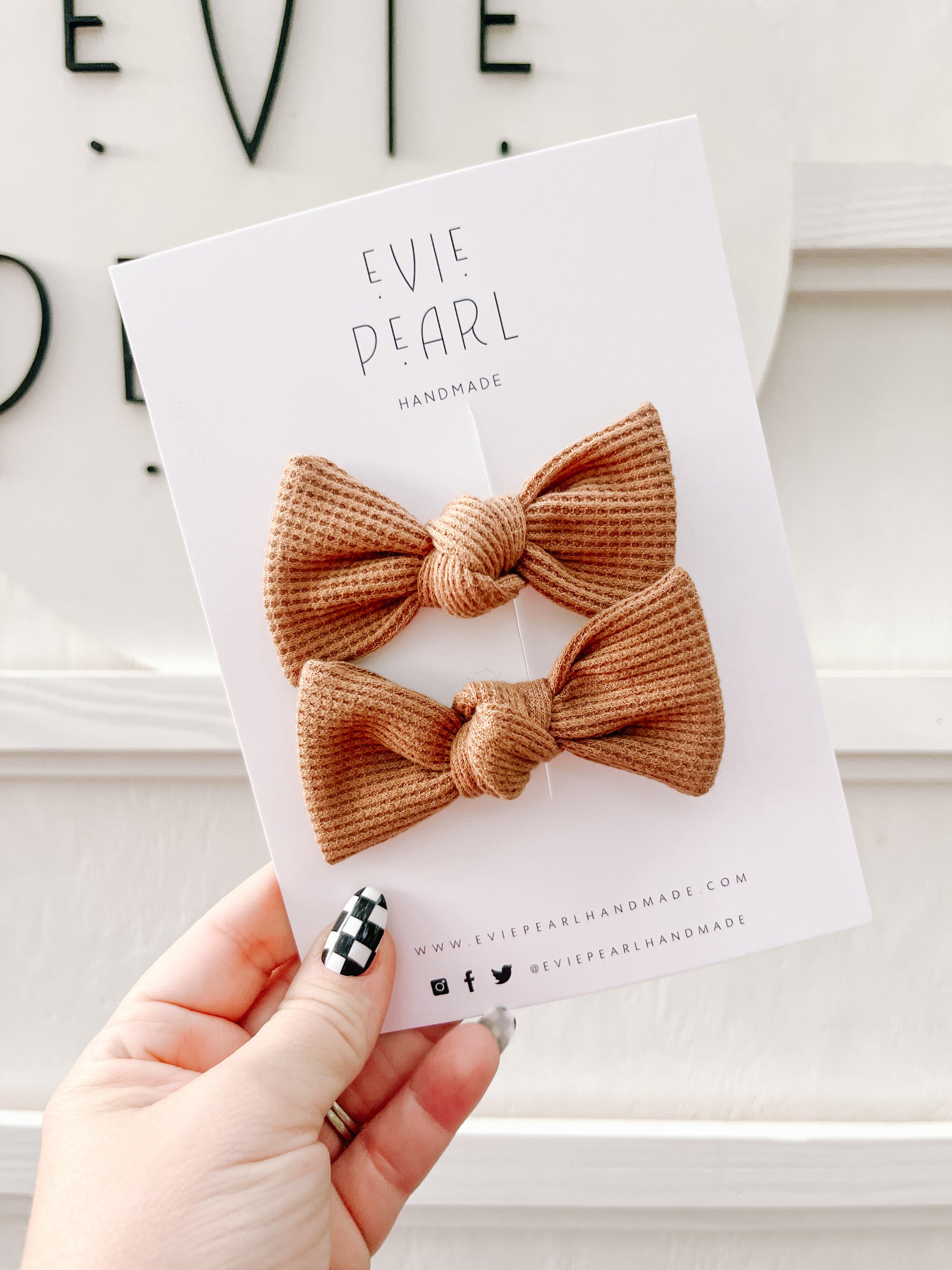 Tan waffle knit pigtail bow set, perfect for fall outfits. Each 2” x 3” bow is attached to a right and left large alligator clip with teeth grippers for a secure hold on all hair types: fine, thick, or curly. Designed for toddlers, girls, and big kids, these bows can be worn as pigtails or separately for everyday autumn style.